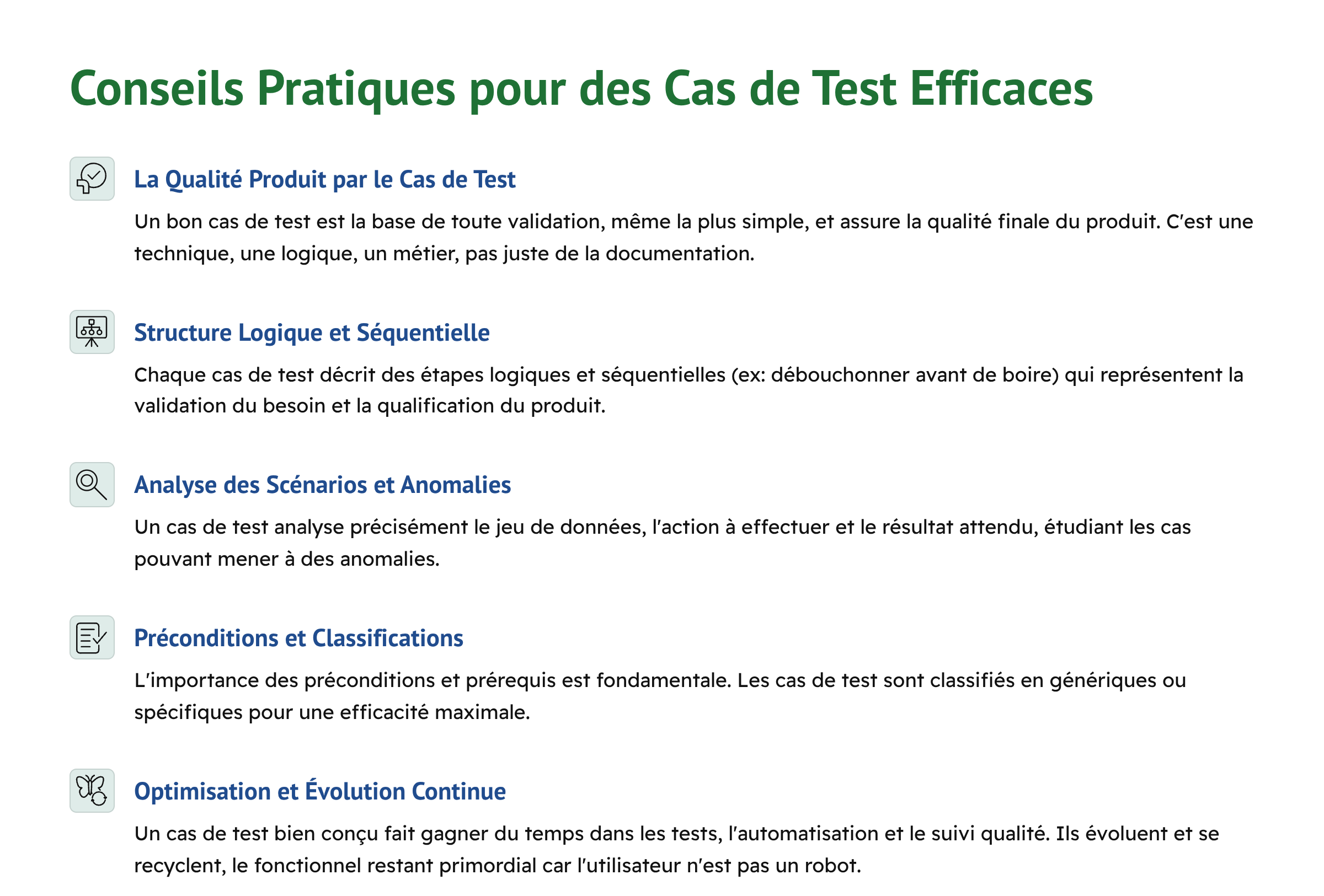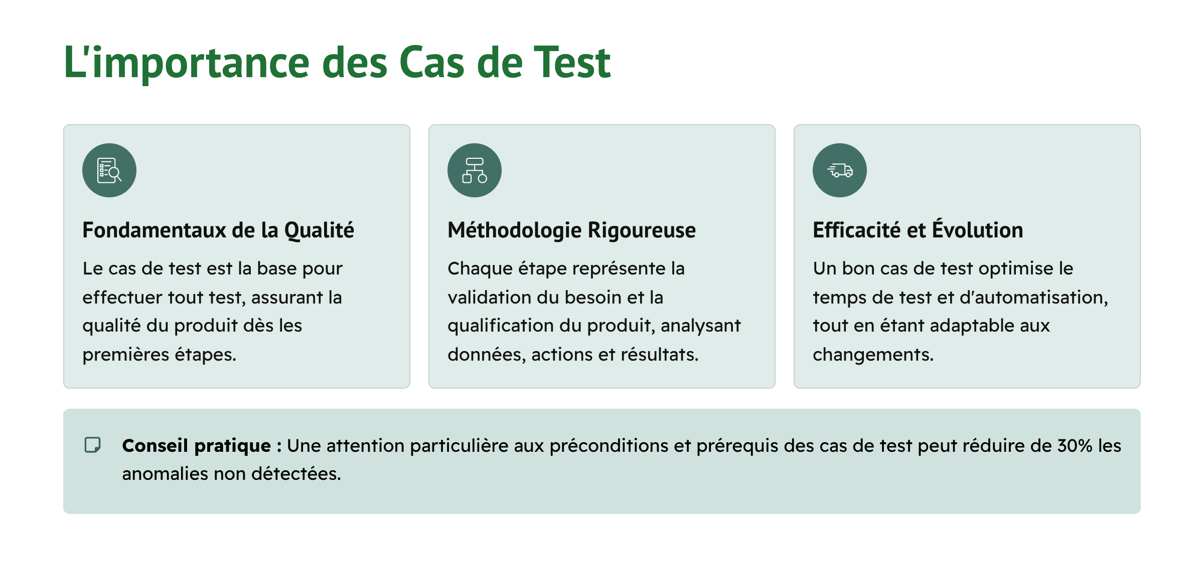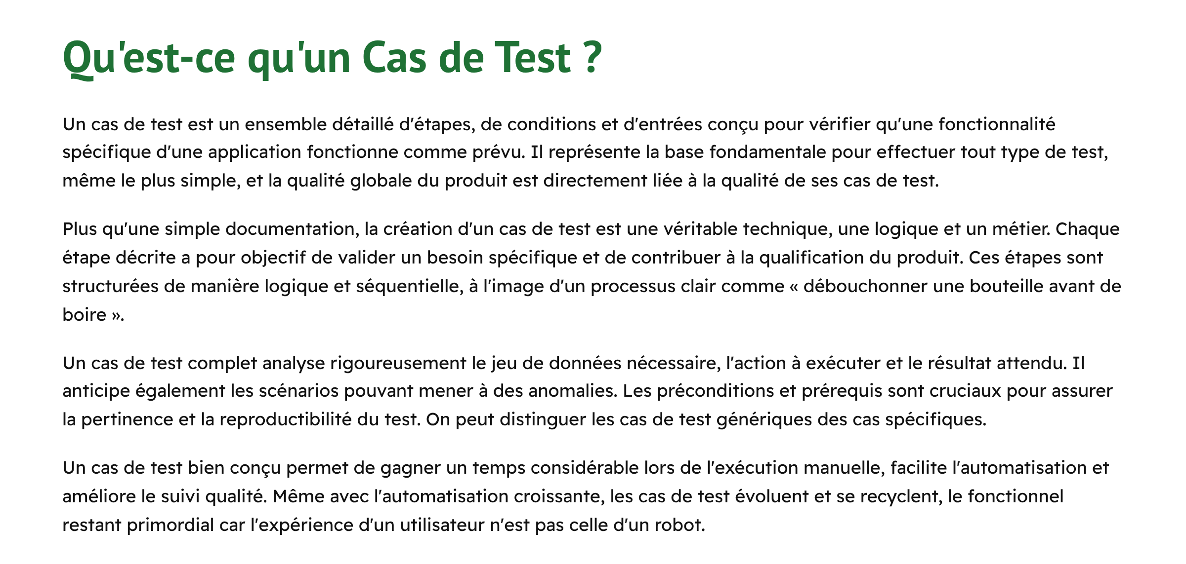 Un cas de test bien conçu offre un gain de temps considérable, non seulement pour l’exécution manuelle, mais aussi pour l’automatisation des tests et le suivi de la qualité. Il s’agit d’un investissement initial qui paie sur le long terme.