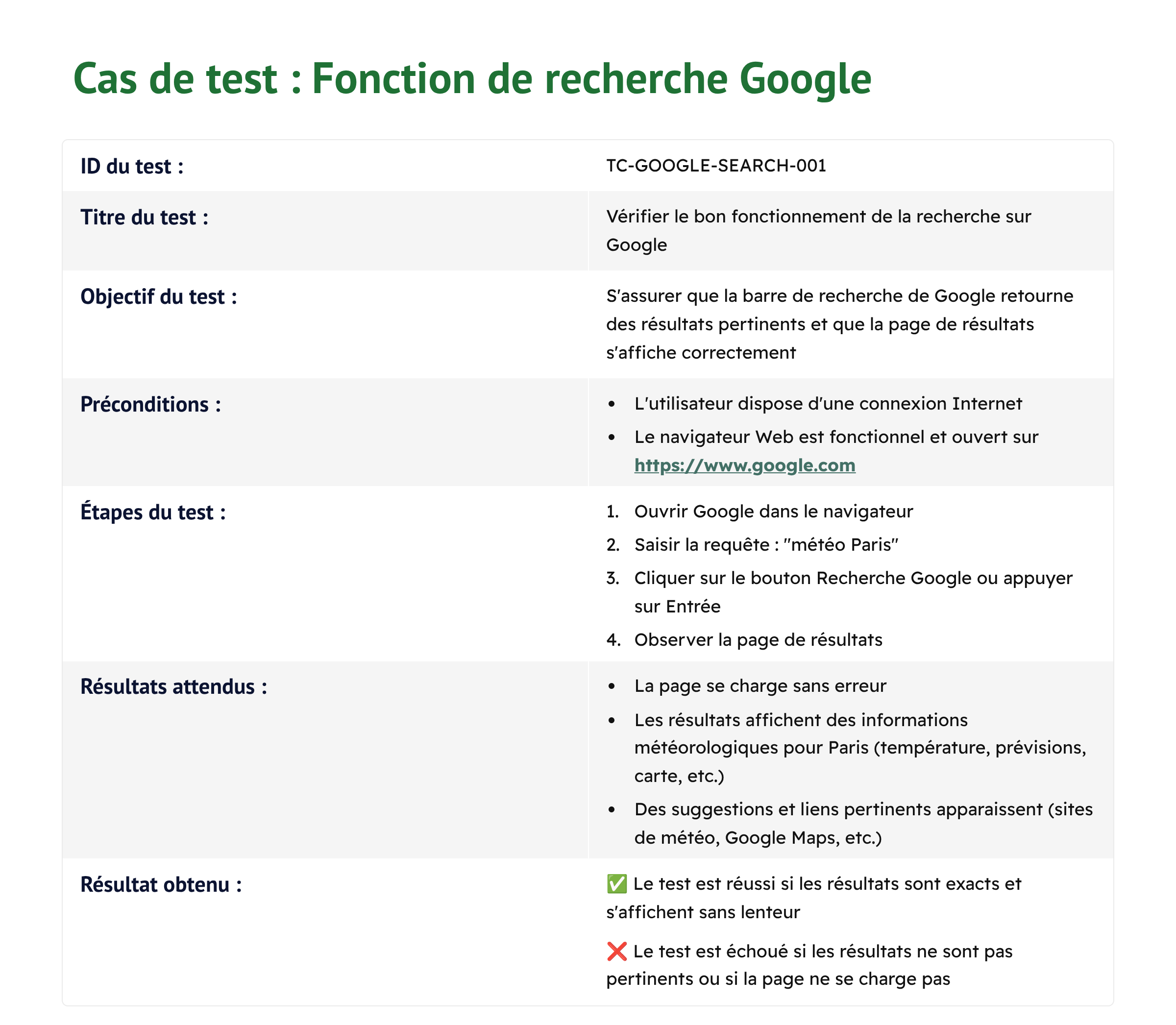 Avant d’écrire un cas de test, il faut analyser et comprendre les fonctionnalités, définir les préconditions et les prérequis nécessaires. Un bon cas de test se concentre sur l’analyse du jeu de données en entrée, l’action à effectuer et le résultat attendu. Il doit également anticiper les scénarios pouvant mener à des anomalies.